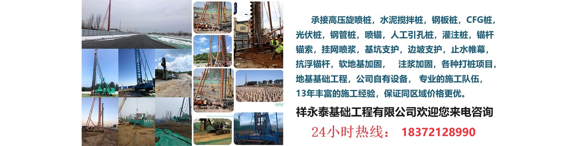 祥永泰基礎工程有限公司是一家專業從事公路路基、路面、管道及橋頭等軟地基加固的公司;我公司主營高壓旋噴樁施工,水泥攪拌樁施工,三軸攪拌樁施工,注漿加固,錨桿錨索施工,鋼板樁施工,鋼管樁施工,光伏樁施工,CFG樁施工,基坑支護,鉆孔灌注樁,加勁樁,樁基施工,擁有一批經驗豐富的技術、施工人員和專業的成套壓漿設備。公司有專業施工技術人員10余人、施工人員70余人、壓漿成套設備30余套、施工車輛20余臺,施工人員全部經過專業的現場培訓,多人具有數十年的鉆孔、壓漿施工經驗;所有機械設備、車輛安排專人定期保養;保障了壓漿施工的安全、質量及進度。 公司以完善到位的專業化施工技術贏得了省內外項目業主的信賴和好評,公司在堅持技術創新的基礎上,狠抓質量管理,不斷提高服務水平,實現了公司業務的良性發展。